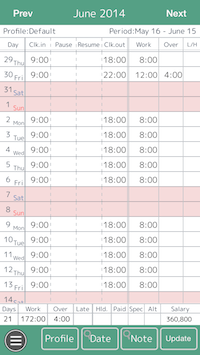 【Work Log】【Tips】一覧の集計欄を切り替える ※この件のサポートページはこちら 月別の一覧表示(カレンダー表示とも言われてますが)の時、 オレンジの範囲を約1秒間長押しする度に 日本語 デフォルト(初回起動時) 給与概算無しの場合 表示欄の拡大 英語 3種類の表示に切り替えることが出来ます 関連 By 管理人 | 2014-06-27 | FAQ, WorkLog, 使い方 | ← 【Work Log】Ver.1.4.7申請中 【Work Log】【Tips】時間の丸め方設定 →