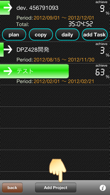 使い方(Project/Task設定) -Workload- Project/Taskの設定 Project登録編集画面は、”Project”から 新しいProjectを追加しますProjectの下のTaskを追加するには addTaskボタン同じTaskの繰り返しで新規にProjectを作成したい時はcopyボタン Project期間、総時間、1日の目標時間設定はplanボタン 1日毎の時間配分はdailyボタン Projectを消す時は、セルをスワイプ Project名を変更したい時は、セルを長押し(約1sec) plan編集 ボタン1日(daily)。。。1日の目標時間、日程を設定して、総時間を求めますトータル(total)。。。期間中の総時間、日程を設定して、1日当たりの目標時間を求めます 期間(duration)。。。開始日、1日の目標時間、総時間を設定して、終了日を求めます 曜日選択(select weekday)。。。含める曜日を選択します(緑色)。画像の様に、土日を含めたくない場合はタップして黒色にします