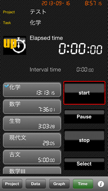 予め設定した仕事、作業、勉強科目など(タスク)別の時間を計測、集計し記録します。